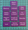 This set of 13 stratagem tokens, printed with text on one side and plain purple on the other, for use with To The Strongest! If you should lose a chit (it happens!), please message me and I can include a replacement...- Page 1 of 2